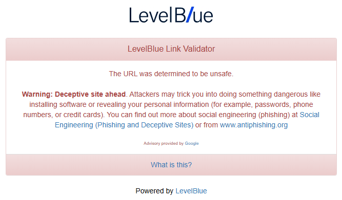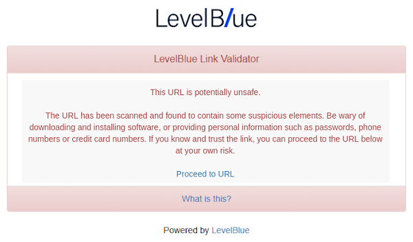 In some cases the scan notes a page as suspicious, but with lower confidence. In these cases the validator page presents a warning, but allows click-through to the original site.