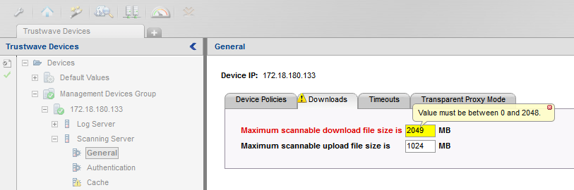 - SWG proxy is limited to downloading/uploading files up to 2GB in size. This limit is configured in the Downloads tab under Administration > System Settings > SWG Devices > Scanning Server > General node: