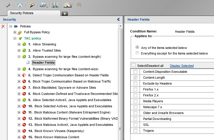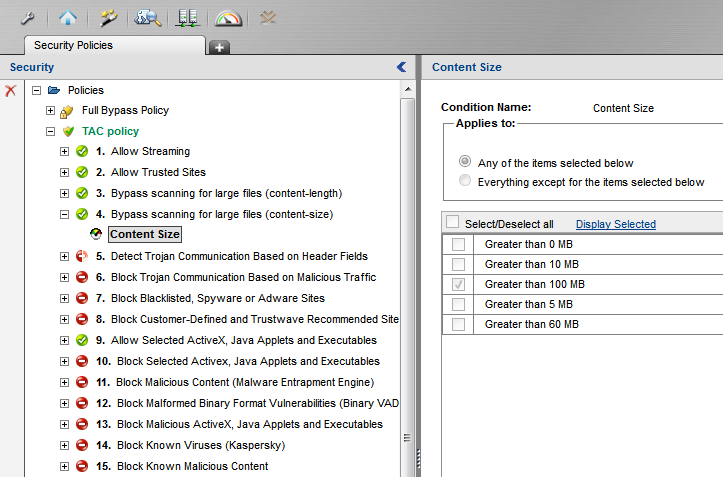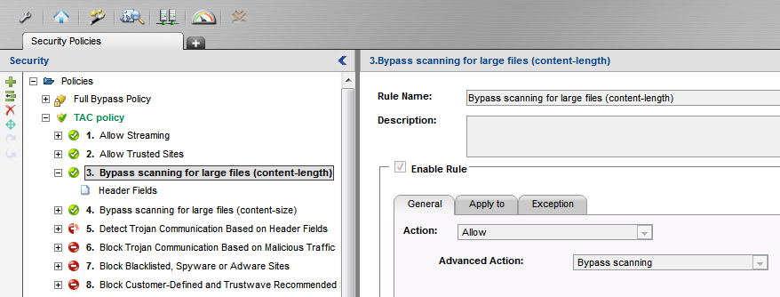 If SWG proxy is expected to deal with many large files, it may help to bypass scanning for those files. This can be done by creating two additional rules in the Security Policy, as detailed below.