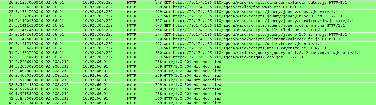 Some pages/HTTP servers are poorly designed and send confirmations for every page, script, or resource request in a non-parallel manner (one after another). In this example, note the many HTTP messages "HTTP/1.0 304 Not Modified".