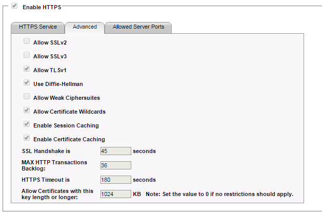 The following image shows the advanced tab of the HTTPS service settings with 'Allow SSLv3' disabled.