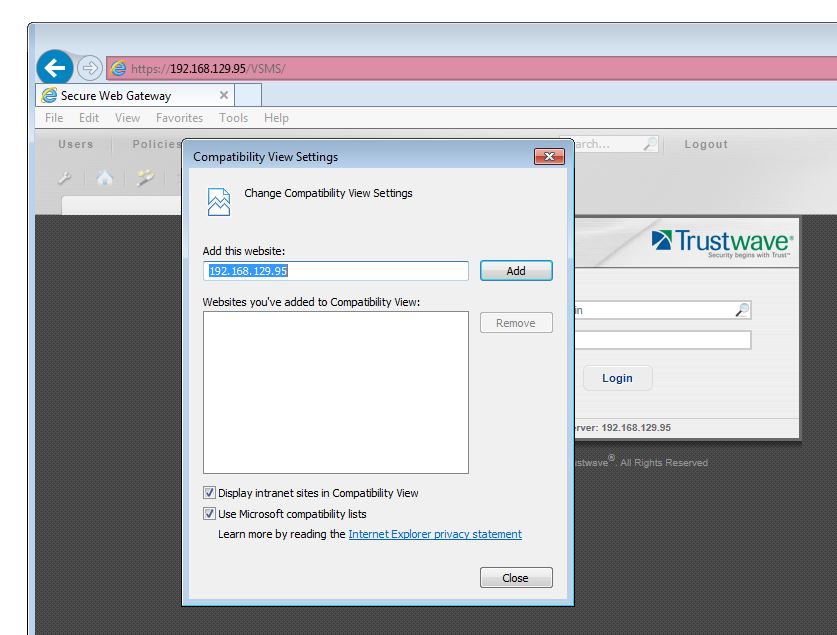 - Add the IP address or hostname of the SWG Server to the list of websites added to Compatibility View: