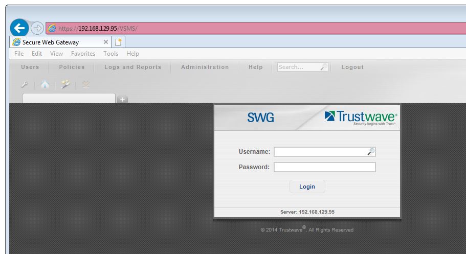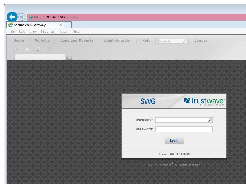 - Close the Compatibility View Settings dialog and reload the SWG management console. Observe the correct positioning of the login box.