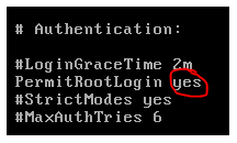 - Use the arrow keys to find the line that says PermitRootLogin*, and change it to yes