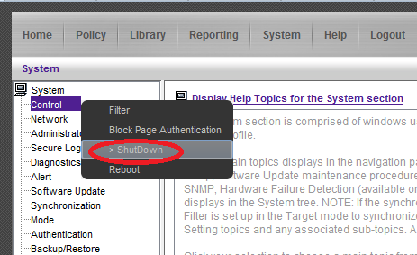 - Bring the system down: Navigate to System > Control and click ShutDown