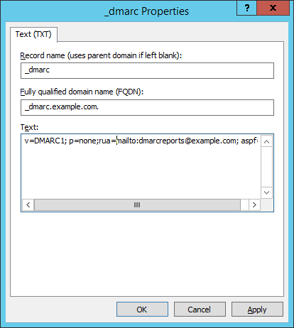 - Create a DNS Resource Record of type TEXT with a record name like _dmarc.domain.TLD